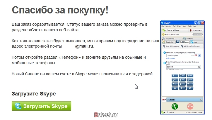 7. После удачного пополнения счёта вы увидите сообщение "Спасибо за покупку, и что через несколько минут ваш личевой счёт в SkyPe пополнится"