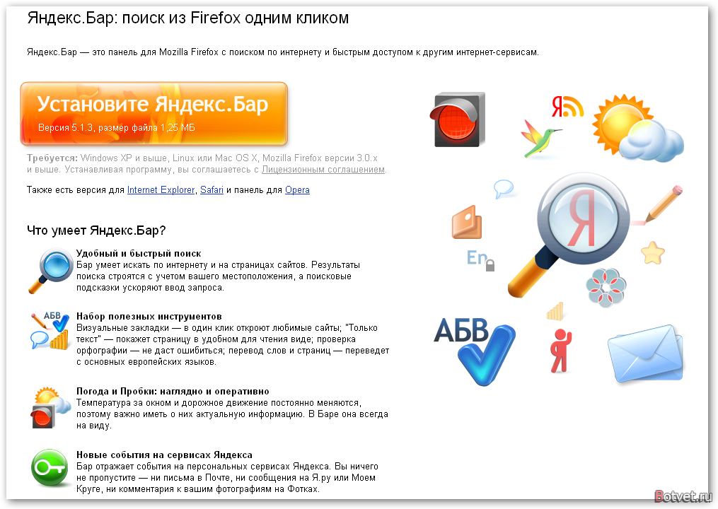 1) Заходим на официальный сайт дополнения к браузеру Мозила "Яндекс Бар"